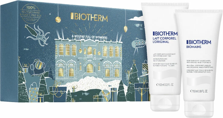 Den perfekte gave, der byder på to fugtgivende cremer, helt ideelt til den tørre vinterhud. <br><br>Indhold: <br><br>- Biomains Håndcreme, 100 ml.<br><br>- Lait Coropel Bodylotion, 100 ml. <br><br><br>Biotherm Biomains Handcream er en fugtgivende og nærende håndcreme. Teksturen styrker hudens naturlige forsvar og holder hænderne bløde og glatte. Den vandresistente creme indeholder D-Panthenol og antioxidanter, der beskytter huden mod skader. Duften er mild og ren, cremen fedter ikke og trænger hurtigt ind.<br><br><br>Biotherm Lait Corporel Body Milk er en frisk og fugtgivende bodylotion. Velegnet til alle hudtyper. Beriger huden med fugt. Indeholder algen Life Plankton, med oprindelse fra de franske pyrenæer, kendt for sin beroligende, regenerende egenskaber. Ekstrakter af citrusfrugter og Vitamin-E for en blød og smidig hud. Huden på kroppen opleves fugtet, fugtighedsbarriererne styrket, og elasticiteten øges.