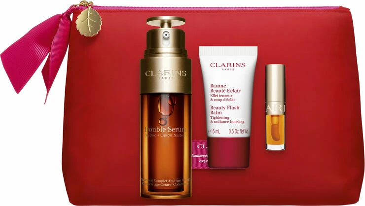 Double Serum gavæsken indeholder b.la double serum der som et 2 i 1 anti-age produkt der tilføre huden fugt, næring og glød. Den efterlader huden strålende, ensartet, fast og blød. Den perfekte forkælelse til enten dig selv, eller en du holder af.<br><br><br>Indhold:<br>- Double Serum (50 ml) (full size)<br>- Beauty Flash Balm (15 ml)<br>- Instant Comfort Lip Oil (2,5 ml)<br><br><br>Double Serum:<br>2-i-1 serum med dobbelt anti-age effekt til alle hudtyper og alle aldre. Double Serum genopbygger, fugter, ilter, nærer og beskytter huden og efterlader den strålende, ensartet, fast og blød. Varm produktet op i håndfladerne og påfør med lette tryk på ansigt og hals hver morgen og aften før din dag- og natcreme.<br><br> Beauty Flash Balm:<br>En balm der udvisker tegn på træthed samt stress. Efterlader huden fugtet, klar og strålende. Perfekt før en travl dag eller en aften i byen.<br><br>Instant Comfort Lip Oil:<br>Instant Comfort Lip Oil er en ikonisk farvet læbeolie, beriget med økologiske naturlige olier. Giver glossy naturlige læber, med plumping effekt. Giver fugt, næring, beskyttelse og reparation, uden at klistre.