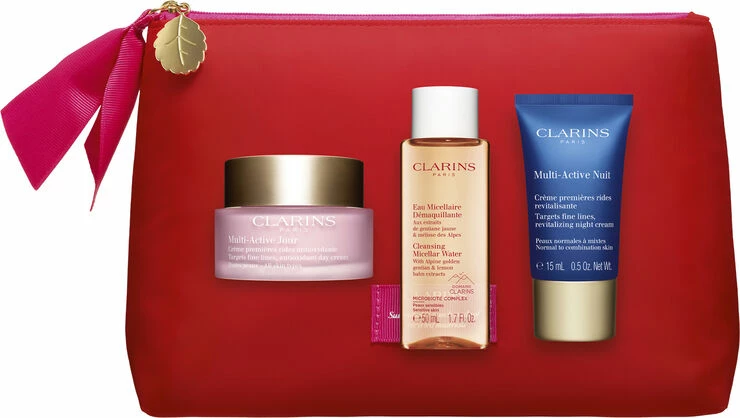 Søger du en fugtughedsgivende antiage serie til de første alderstegn ? Så er det altså Multi Active du skal have fingrene i. Denne serie giver glød, frisker huden op og beskytter huden både morgen og aften.<br><br><br>Indhold:<br>- Multi-Active Day Cream (50 ml) (full-size)<br>- Multi-Active Night Cream Normal/Combination Skin (15 ml)<br>- Micellar Cleansing Water (50 ml)<br><br><br>Multi-Active Day Cream:<br>En cream-gel til kombineret hud, som giver huden masser af fugt og beskyttelse samt forebygger og minimerer de første linier. Ansigstrækkene bliver glattere, og huden bliver mere klar og smidig. <br><br>Multi-Active Night Cream:<br>En natcreme til normal til tør hud, som giver huden masser af fugt og beskyttelse samt forebygger og minimerer de første linier. Ansigstrækkene bliver glattere, og huden bliver mere klar og smidig.<br><br>Micellar Cleansing Water:<br>En nem alt-i-én rens beriget med Gentle Complex fra Le Domaine Clarins (økologisk gul ensian & økologisk citronmelisse), renser huden i ét enkelt trin, samtidig med at hudens naturlige balancer respekteres.