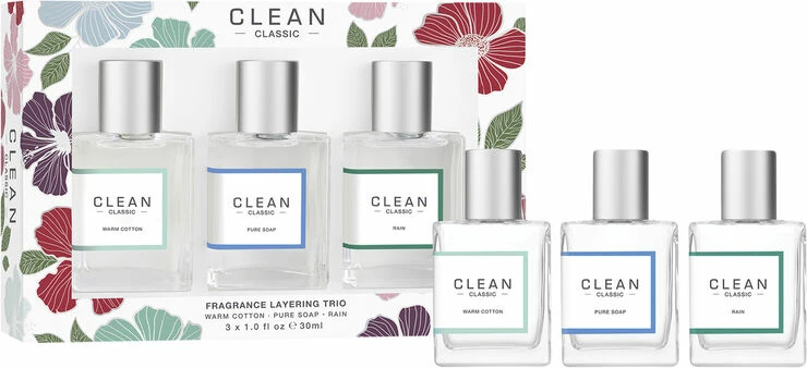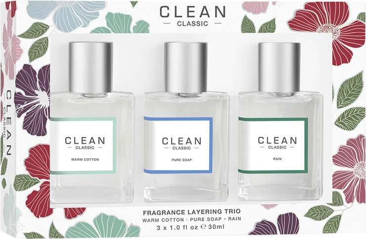 Omfavn julens magiske ånd med denne eksklusive gaveæske med tre skønne duftklassikere fra CLEAN.<br><br><br>Indhold:<br><br>- Warm Cotton 30 ml.<br>- Pure Soap 30 ml.<br>- Rain 30 ml.<br><br>Alle tre dufte er de helt store bestsellers fra Clean. <br><br>Warm Cotoon: <br><br>Classic Clean Warm Cotoon Eau dde Parfum er en parfume med helt uimodståelig duft. Den leder tankerne hen på nyvaskede og rene håndklæder. Duften er med duftnoter af blandt andet jasmin, lilje, ctrus, der sammen med <br>varme toner af moskus og rav efterlader dig med en skøn, ren og beroliget følelse. <br><br>Pure Soap:<br><br>Den ultimative rene og friske duft der er opløftende og fornyende. Pure Soap Eau de Parfum efterlader dig med en ren duft på baggrund af en forfriskende kombination af aromatiske duftnoter af lavendel og moskus. <br>Denne parfume er perfekt til at give en frisk start på dagen. <br><br>Rain: <br><br>Classic Clean Rain er en klassisk, frisk og ren duft, der dufter som dugfrisk og lun regn på en varm sommerdag. Der er noter af blandt andet: violblade, melon, marguritter og påskeliljer. <br>Kombinationen af disse duftnoter giver en meget mild og ren duft.