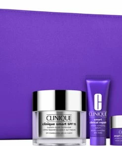 En kollektion af vores bedste formler, der giver dig resultater, du kan se. En helt perfekt julegave til en du holder af. <br><br>Indhold:<br><br>- Clinique Smart SPF 15 Custom-Repair Moisturizer for Dry Combination Skin, 50 ml.<br><br>- Clinique Smart Clinical Repair Wrinkle Correcting Serum, 10 ml.<br><br>- Clinique Smart Clinical Repair Wrinkle Correcting Eye Cream, 5 ml.<br><br>- Lilla Toilettaske. <br><br><br>Hvad gør produktet? <br><br>- Dette team af hudplejeeksperter udvisker linjer og rynker.<br><br>- Clinique Smart Clinical Repair Wrinkle Correcting Serum, vores mest avancerede anti-aging-serum, reducerer synligheden af linjer og rynker.<br><br>- Daytime Clinique Smart™ Custom-Repair Moisturizer nærer og beskytter med SPF.<br><br>- Clinique Smart Clinical Repair™ Wrinkle Correcting Eye Cream styrker den sarte hud omkring øjnene.