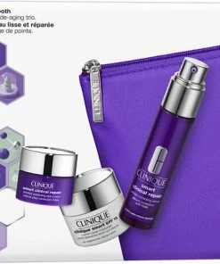 En innovativ anti-aging-trio, der giver huden et mere ungdommeligt udseende. En perfekt julegave, eller hvis du skal forkæles ekstra. <br><br>Indhold: <br><br>- Clinique Smart Clinical Repair Wrinkle Correcting Serum, 30 ml.<br><br>- Clinique Smart SPF 15 Custom-Repair Moisturizer for Dry Combination Skin, 15 ml.<br><br>- Clinique Smart Clinical Repair Wrinkle Correcting Eye Cream, 5 ml.<br><br>- Lilla toilettaske<br><br><br>Clinique Smart Clinical Repair: Er målrettet mod hele spektret af linjer og rynker og angriber fra tre separate vinkler. Genopbygger: Boost hudens naturlige kollagen med CL1870 Laser Focus Complex. Fornyer: Udglatter huden med potent retinoid. Giver fylde: Fugter fine rynker med hyaluronsyre. Huden bliver synligt forynget, glattere og smidigere at røre ved, og hudens glød og spændstighed genoprettes. <br><br><br>Clinique Smart SPF 15 Custom Repair: Anti-age, oliefri formel med Clinique Smart hydreringsteknologi hjælper huden med at tiltrække og bevare fugt.<br><br><br>Clinique Smart Clinical Repair Wrinkle Correcting Eye Cream: Huden omkring øjnene er sart og modtagelig for skader. Vores øjencreme bekæmper rynker og er udviklet til at styrke denne hud, så den bliver stærkere, synligt glattere og mere spændstig. Hjælper med synligt at udglatte linjer og rynker samt styrker huden fra flere vinkler: Booster hudens naturlige kollagen, støtter hudens naturlige struktur og styrker hudens fugtbarriere.