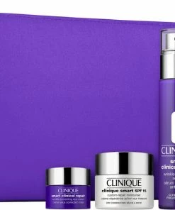 En innovativ anti-aging-trio, der giver huden et mere ungdommeligt udseende. En perfekt julegave, eller hvis du skal forkæles ekstra. <br><br>Indhold: <br><br>- Clinique Smart Clinical Repair Wrinkle Correcting Serum, 30 ml.<br><br>- Clinique Smart SPF 15 Custom-Repair Moisturizer for Dry Combination Skin, 15 ml.<br><br>- Clinique Smart Clinical Repair Wrinkle Correcting Eye Cream, 5 ml.<br><br>- Lilla toilettaske<br><br><br>Clinique Smart Clinical Repair: Er målrettet mod hele spektret af linjer og rynker og angriber fra tre separate vinkler. Genopbygger: Boost hudens naturlige kollagen med CL1870 Laser Focus Complex. Fornyer: Udglatter huden med potent retinoid. Giver fylde: Fugter fine rynker med hyaluronsyre. Huden bliver synligt forynget, glattere og smidigere at røre ved, og hudens glød og spændstighed genoprettes. <br><br><br>Clinique Smart SPF 15 Custom Repair: Anti-age, oliefri formel med Clinique Smart hydreringsteknologi hjælper huden med at tiltrække og bevare fugt.<br><br><br>Clinique Smart Clinical Repair Wrinkle Correcting Eye Cream: Huden omkring øjnene er sart og modtagelig for skader. Vores øjencreme bekæmper rynker og er udviklet til at styrke denne hud, så den bliver stærkere, synligt glattere og mere spændstig. Hjælper med synligt at udglatte linjer og rynker samt styrker huden fra flere vinkler: Booster hudens naturlige kollagen, støtter hudens naturlige struktur og styrker hudens fugtbarriere.