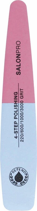 Neglefil og polerfil i ét, korn 220/600/1000/3000.<br>Til naturlige negle og kunstnegle. Giver rigtig længde og blanke negle i fire trin.<br>Fil længden til med den blå flade, korn 220. Gør forsigtigt neglen ”ru” med den rosa flade, korn 600. Poler i 15 20 sekunder med den grå flade, korn 1000. Blankpoler herefter med den hvide flade, korn 3000 for en blank slutfinish. Vedligehold højglansen med polerfladerne korn 1000 og 3000.<br>Fremstillet af professionelt materiale, der giver en ekstra lang holdbarhed. Filen kan vaskes og desinficeres.