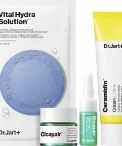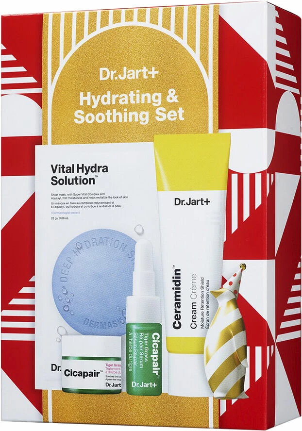HVAD DET ER<br><br>Dr.Jart+'s fugtgivende og beroligende hudplejesæt til sensitiv hud! <br><br>Indeholder de bedst sælgende produkter fra Masken, Ceramidin Cream, Cicapair Color Correcting Treatment og meget mere! <br><br><br>HVORFOR VI ELSKER DET<br><br>+Cicapair Tiger Grass Color Correcting Treatment 5ml<br><br><br>: Grøn-til-beige creme, der tilpasser sig hudens naturlige farve for at neutralisere rødme og udjævne hudtonen.<br><br>+Cicapair Tiger Grass Re.pair Serum 5ml<br><br><br>: Letvægts watery gel serum, der lindrer udseendet af rødme og hjælper med at styrke, forbedre hudens forsvar mod tørhed.<br><br>+Ceramidin Cream 50ml<br><br><br>: Nærende creme, der låser fugt inde for at give øjeblikkelig dyb fugt og komfort til tør, trist hud, samtidig med at hudens fugtbarriere styrkes.<br><br>+Dermask Water Jet Vital Hydra Solution<br><br>: Dybt fugtgivende og revitaliserende arkmaske, der hjælper med at reducere udseendet af fine tørre linjer, og som slukker og trøster tør hud ved kontakt.