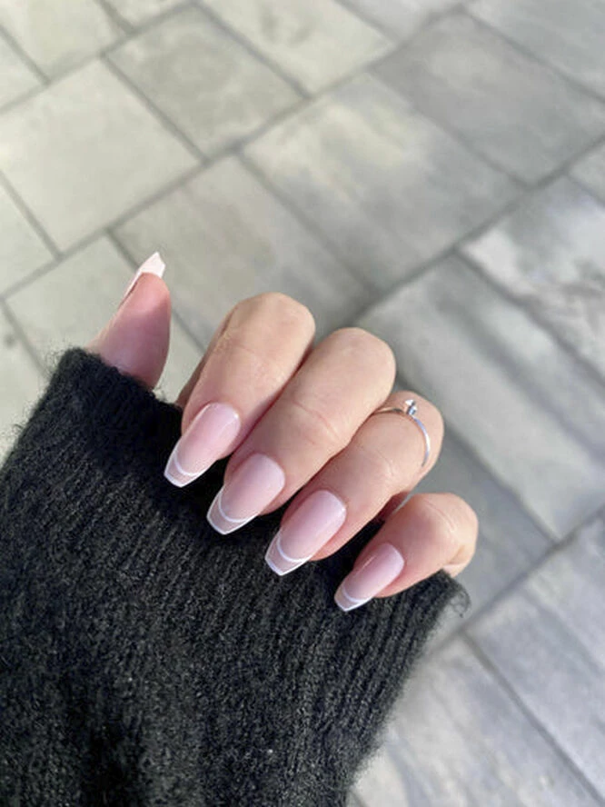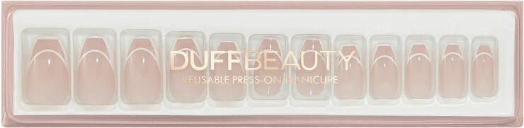 Opnå perfekte salon-lignende negle på få minutter! DUFFBEAUTYs nye Reusable Press on negle kommer i fem forskellige former og design.Double French er inspireret af den klassiske hvide manicure, men en twist. I æsken medfølger 24 negle i 12 forskellige størrelser, en neglebuffer/neglefilm og en DUFF langtidsholdbar med skånsomme neglelim. Coffin = Medium længde
