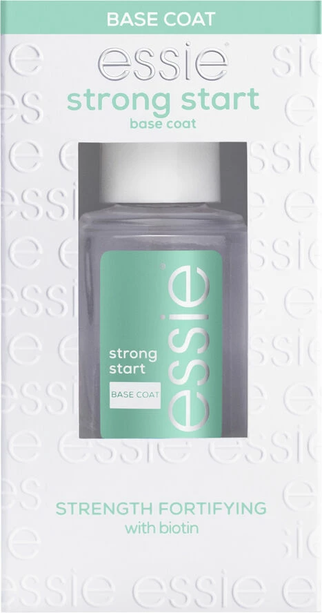 Styrkende base coat vores styrkende formel, som booster dine negles styrke, er beriget med biotin og hjælper til at undgå svage negle samt negle som ser skrøbelige ud. resultat: en smuk manicure fordi dine negle er stærke og modstandsdygtige over for at skalle, flække og gå i stykker. Anvendelse: påfør et lag essie® strong start base coat på rene negle, og lad tørre. påfør derefter to lag essie® neglelak, og afslut med en essie® topcoat.