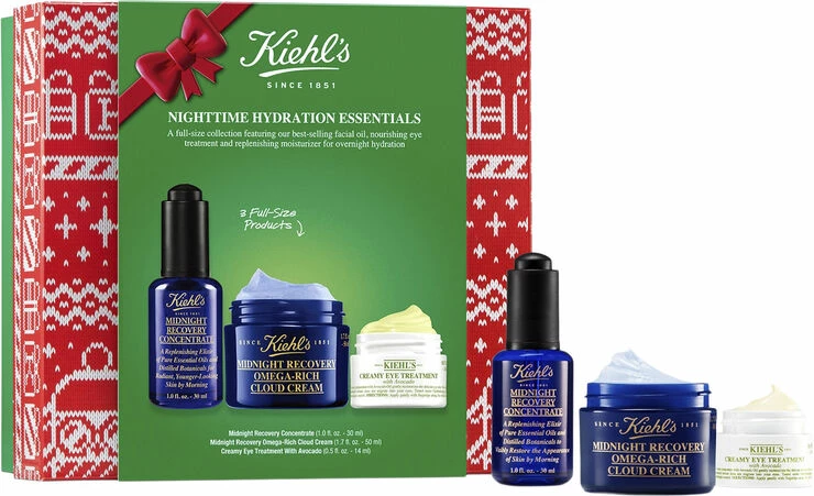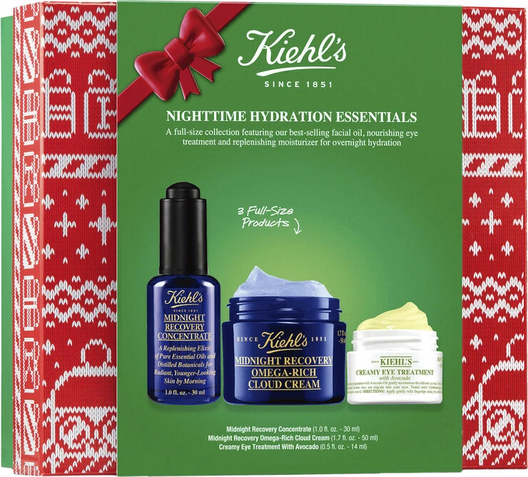 Kiehl's Nighttime Essentials gaveæske indeholder:<br><br>- Midnight Recovery Concentrate (30 ml)<br>- Avocado Øjencreme (14 ml)<br>- Midnight Recovery Cloud Natcreme (50 ml)<br><br>Kan du, eller den du ønsker at glæde, lide lækre og effektive hudplejeproduktet til natten? Så er denne gaveæske fra Kiehl's det helt rette.<br><br>Gaveæsken indeholder 3 aktive produkter som passer perfekt til hende eller ham, som ønsker et komplet sæt til natten.<br><br>Midnight Recovery Concentrate (30 ml):<br>Kiehl's Midnight Recovery Concentrate ansigtsolie er formuleret med velduftende æterisk lavendelolie, natlysolie og squalane, kendt for at styrke hudens fugtbarriere.<br>Efter en god nattesøvn, opleves huden mere fast, blød og med en fornyet glød.<br><br>Avocado Øjencreme (14 ml):<br>Kiehl's Creamy Eye Treatment with Avocado er en ultracremet øjencreme til alle hudtyper, der giver selv det sarte øjenområde et effektivt fugtboost som efterlader huden fugtet og blød.<br><br>Midnight Recovery Cloud Natcreme (50 ml):<br>Denne nærende natcreme har en let konsistens og er lavet med naturlige æteriske olier som er rige på omega 3 og 6 fedtsyre.<br>Olierne hjælper med at styrke hudens beskyttende lipidbarriere og sikre at din hud er gennemfugtet natten over, samtidig med at den giver dig et mere fyldigt udseende.<br>Vågn op til følelsen af mere udglattet og fyldig hud samt fornyet glød.