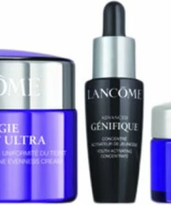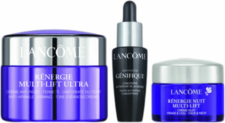 Sættet indeholder: <br>- Rénergie Multi-Lift Ultra Dagcreme (50 ml)<br>- Rénergie Multi-Lift Ultra Natcreme (15 ml)<br>- Advanced Génifique Serum (10 ml)<br><br><br>Rénergie Multi-Lift Ultra Dagcreme:<br>Lancôme Rénergie Multi-Lift Ultra SPF 20 er en moderne anti-age creme med en delikat tekstur, der smelter ind i huden. Huden synes fastere og mere fyldig, med en mere ensartet og klar hudtone og ansigtets konturer mere definerede. Huden føles mere fast, og linjer og rynker synes reducerede. Den nye stjernecreme med SPF inden for Rénergies anti-age-ekspertise.<br><br><br> Rénergie Multi-Lift Ultra Natcreme<br>Lancôme Rénergie Multi-Lift Ultra Creme 50 ml.<br>Beriget med hyaluronsyre og pro-løftende hørfrøekstrakt, vores dagcreme virker opstrammende og fugtgivende på din hud.<br>Cremen har dokumenteret tredobbelt effekt: Huden synes fastere, rynker og fine linjer er reduceret, og hudtonen er mere klar og ensartet idet pigmentpletter synligt reduceres.<br><br>Advanced Génifique Serum:<br>Lancôme Génifique Youth Activating Concentrate er et serum, der styrker hudens ungdommelige udseende.<br>Huden synes yngre og mere strålende, teksturen forbedres, og huden efterlades med en silkeblød finish.<br>Efter blot 7 dages brug oplever 8 ud af 10 kvinder, at hudens udseende er forbedret.