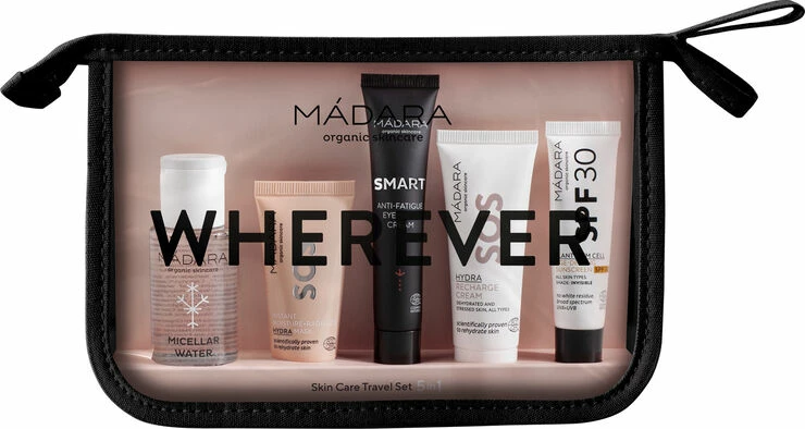 Ankom med fantastisk hud, hvor end livet bringer dig! Dette sæt indeholder 5 x MÁDARA bestsellers, der booster fugt, giver komfort og glød samtidig med at beskytte din hud mod eksterne stressfaktorer. Micellar Water (50 ml) fjerner makeup og urenheder uden at fjerne hudens naturlige indhold af fugt. SOS Instant Moisture+Radiance Hydra Mask (12,5 ml) den ultimative favorit at anvende efter en flyvetur. Fugter huden i dybden og genskaber hudens komfort og glød. Smart Anti-Fatigue Eye Rescue Cream (15 ml) fugter, opstrammer og lysner huden ved øjenområdet. Målrettet hævelse, mørke rande og tegn på træthed. SOS Hydra Recharge Cream (20 ml) styrker hudens barriere og bevarer fugt i huden, som efterlades blød og glat. SPF30 Plant Stem Cell Age-Defying Face Sunscreen (10 ml) sikrer bredspektret UVA/UVB-beskyttelse og forebygger tegn på aldring. Alle produkterne er samlet i en rejsevenlig taske i genanvendt materiale. Brug den resten af livet (og hvis ikke, er den 100% genanvendelig)