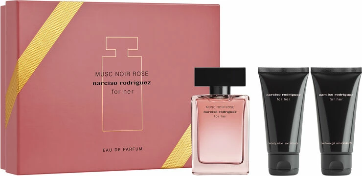 Indhold:<br>- Musk Noir Rose Eau de Parfum, 50ml.<br>- Bodylotion, 50ml.<br>- Showergel, 50ml.<br><br><br>Musk Noir Rose: <br>Med øje for enkelhed og fokus på det yderst væsentligste guidet af kvindelighed og elegance. For her kollektionen er Narciso Rodriguezs gave til kvinder og en hyldest til deres indre skønhed. Det patenterede hjerte af musc, der er en del af hver af duftene, tager sin bærer med på en sensorisk rejse. I MUSC NOIR ROSE eau de parfum er for her's signaturhjerte af musc indhyllet i delikat sensualitet. Duften hylder hver kvindes sande natur – et privat øjeblik, hvor hun afslører sin autenticitet. Varme topnoter af bergamot kombineres med intens tuberose for at skabe en strålende duft. Herefter kommer det fængslende hjerte af musc og forstørrer duftens blomsterbuket, mens bundnoterne af varme orientalske vanilje giver en blødhed til duften.