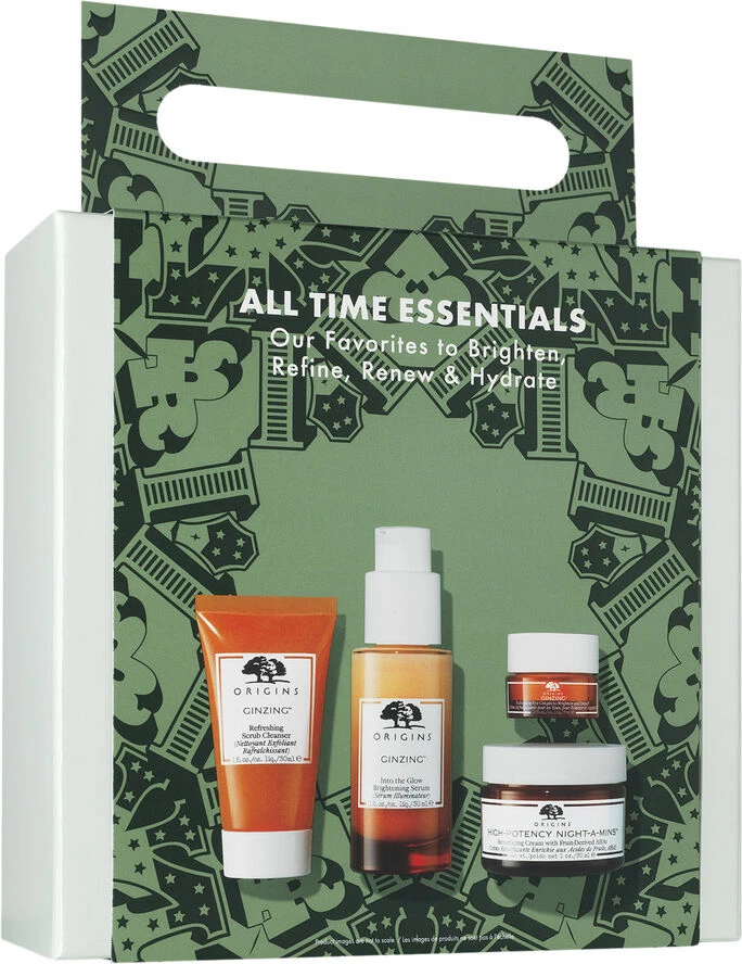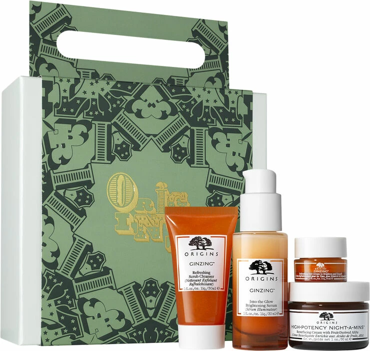 Favoritter fra Origins til en smukkere hud. Lad disse produkter hjælpe dig med at få en glød i ansigtet. Perfekt som selvforkælelse eller julegave til en du holder af. <br><br>Indhold:<br><br>- Origins GinZing Refreshing Scrub Cleanser 30 ml<br><br>- Origins GinZing Into The Glow Brightening Serum, 30 ml.<br><br>- Origins GinZing Refreshing Eye Cream to Brighten and Depuff, 5 ml.<br><br>- Origins High-Potency Night-A-Mins Resurfacing Cream, 30 ml.<br><br><br>Origins GinZing Refreshing Scrub Cleanser: <br>En 2-i-1 energi-boostende rens, der giver huden en blid eksfoliering, forfiner hudens struktur, mindsker synlige træthedstegn og genopliver huden, så den efterlades glat og strålende. Renser blidt og blødgør huden med aminonisyrer fra havre. Dybderenser porerne og gør huden mere jævn med jojoba og carnaubavoksperler. Efterlader huden sund og strålende ved at støtte hudens funktioner med koffein (fra kaffebønner) og tilfører energi til huden med panax ginseng. <br><br><br>Origins GinZing Into The Glow Brightening Serum: Serum der hjælper med at få en smukkere hud, samt mere glød i ansigtet.<br><br>Origins GinZing Refreshing Eye Cream to Brighten and Depuff:<br>modvirker hævelser, indeholder nu C-vitamin og niacinamid og hjælper med synligt at reducere mørke rande. 93 % sagde, at øjenområdet så klarere og mere strålende ud på 4 uger..*<br>*Forbrugertest på 110 kvinder efter 4 ugers brug af produktet.<br><br>Origins High-Potency Night-A-Mins Resurfacing Cream:<br>En 2-i-1-fugtighedscreme og peel til natten, som effektivt modvirker grå og trist hud, så huden får fornyet glød og fremstår glat og opfrisket. Indeholder AHA-frugtsyrer baseret på vindruer og sukkerroer, som giver en peelende effekt, der effektivt fjerner tørre og døde hudceller. B-, C-, E- og H-vitaminer samt kalcium bidrager til at genopbygge og styrke huden, mens du falder i søvn til den beroligende duft af æteriske olier med neroli, baldrian og vanilje. Du vågner op med en opfrisket og fornyet hud. Anvend om natten i ansigtet og på halsen.