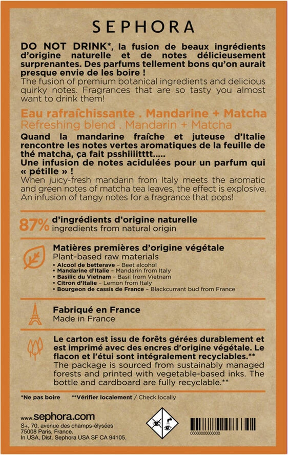 <p> Giv efter for fristelsen ved Do not Drink Mandarin + Matcha, en mousserende duft til både mænd og kvinder, lavet med 87% naturligt afledte ingredienser. </p> <p> <br> </p> <p> Kollektionen Do Not Drink Tasty Fragrances, er produceret i Frankrig, er fyldt med overraskende lækre noter lavet med smukke ingredienser af naturlig oprindelse. De dufter så godt, at du måske endda bliver fristet til at drikke dem!