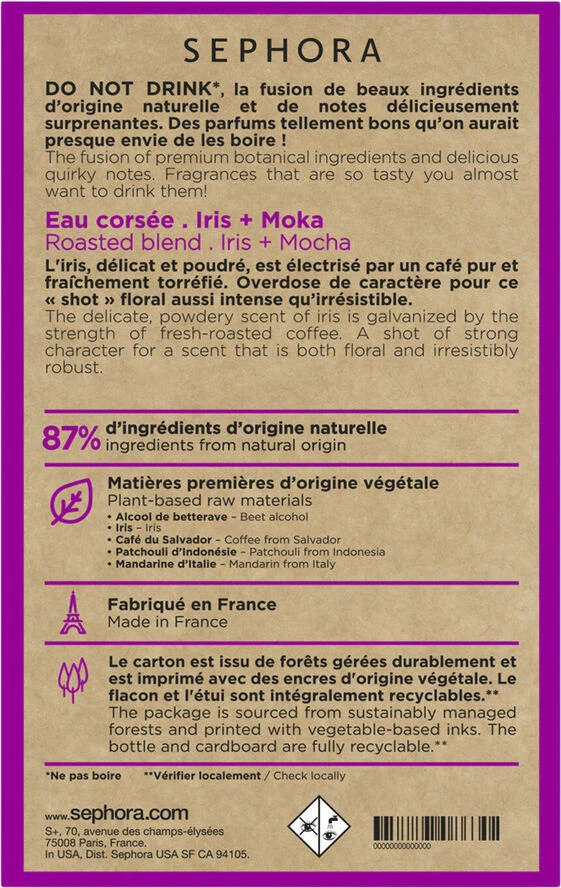 <p> Giv efter for fristelsen ved Do not Drink Iris + Mocha, en fyldig duft til både mænd og kvinder, lavet med 87% naturligt afledte ingredienser. </p> <p> <br> </p>Do Not Drink Tasty Fragrances, er fremstillet i Frankrig, og er fyldt med overraskende lækre og træagtige noter lavet med smukke ingredienser af naturlig oprindelse. De dufter så godt, at du måske endda bliver fristet til at drikke dem!