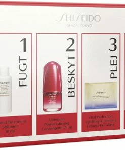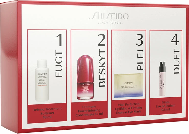 Indhold:<br>- Defend Treatment Softener 19 ml.<br>- Ultimune 15ml.<br>- Vital Perfection eye mask Softener 18ml.<br>- Ginza 0,8ml.<br><br>Hvis du, eller en du holder af nyder af selvforkælelse, er dette det helt rigtige sæt.<br><br><br>Defend Treatment Softener:<br>Optimer hudens immunsystem og hudens eget potentiale for at forhindre generelle problemer. Rensning er det mest grundlæggende skridt i hudpleje derfor har SHISEIDO Renseprodukter og softener der forbygger tørhed, ru overflade, linjer og bevare fugten i huden. Denne softener har en let fugtgivende konsistens og bruges på en vatrunddel i hele ansigtet, for at forberede huden på din efterfølgende pleje. Til normal/kombineret hud.<br><br>Ultimune:<br>Den ultimative løsning til en stærk hud – nu bedre end nogensinde. Et koncentreret serum, der hjælper din hud med at blive stærkere og smukkere, mens effekten af dine øvrige hudplejeprodukter samtidig forstærkes. Hemmeligheden bag en stærk og smuk hud findes i hudens immunforsvar. Er hudens immunforsvar svagt, vil huden være svækket og ude af stand til at beskytte sig selv mod hudproblemer og for tidlig ældning.<br><br>Vital Perfection eye mask Softener:<br>Vital Perfection Uplifting and Firming Eye Mask er en øjenmaske med multi-fordele der øjeblikkeligt strammer op og genne mfugter øjenomgivelserne. Den indeholder den banbrydende ReN eura Technology der skaber hurtigere og mere effektive resul tater.<br><br>Ginza:<br>Duften af en imodståelig kvinde, der udtrykker en dynamisk harmoni. Hun repræsenterer den perfekte balance mellem styrke og femininitet.<br>En frisk blomsterduft af fresia, jasmin, japansk orchid, og magnolia. Det er en blomstrende og træagtigt duft. Denne parfume har formået at skabe paradokser med sine noter, men formår alligevel at få hele duften til at gå op i en højere enhed.