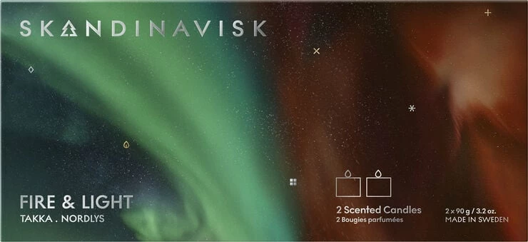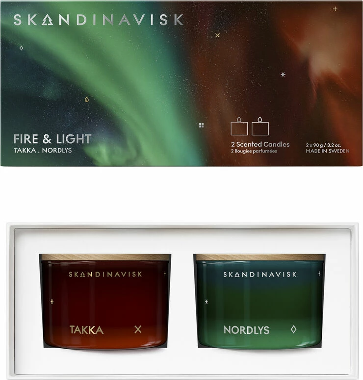 Sættet indeholder: <br><br>- Takka Duftlys<br>- Nordlys Duftlys<br><br>Takka: <br>Duftnoter: Fyrretræ og røget hø, rå uld og sød tobak. En voksblanding bestående af svensk rapsolie<br><br>Nordlys:<br>Duftnoter: Arktisk intensitet og himmelsk farve, en duft, der er lige så ukendt som den er overjordisk.