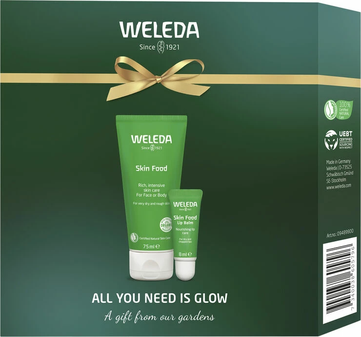 All you need is glow er et perfekt hudplejesæt at have i tasken, lige ved hånden for hurtigt at give huden fugt og glød. En perfekt julegave til hende, som skal forkæles ekstra meget i år. <br><br><br>Indhold:<br><br>- Weleda Skin Food 75 ml.<br><br>- Weleda Lip Balm 8 ml.<br><br><br><br>De næringsrige effektive produkter fugter, styrker og giver hurtigvirkende pleje til tør hud. <br>Skin Food 75 ml Weledas bedst sælgende produkt! Med den originale opskrift fra 1926. Nærende effektiv multicreme, der blødgør og fugter tør til meget tør hud. Bruges med fordel på hudens mest tørre partier, men fungerer lige så godt som primer eller når du vil give huden ekstra glød. Cremen har en behagelig citrusduft og et helt naturligt indhold af nøje udvalgte ingredienser fra gennemprøvede lægeplanter med et højt næringsindhold. <br><br><br> Skin Food Lip Balm 8 ml En fugtgivende læbepomade med beskyttende bivoks og blødgørende solsikkeolie sammen med økologiske planteekstrakter fra kamille, morgenfrue og stedmoder-blomst. Giver hurtigvirkende pleje og næring til tørre læber, forhindrer fugttab og giver langvarig beskyttelse mod ydre belastninger. Giver naturlig glans til læberne. Dermatologisk testet. Perfekt til tørre og sprukne læber med behov for beskyttelse og næring.