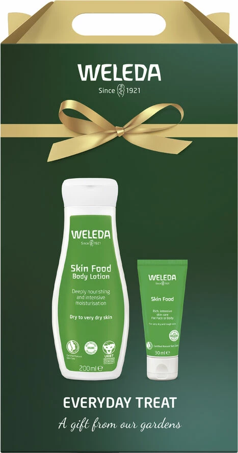 En gaveæske der byder på hudpleje, afslappning og velvære. <br><br>Sættet indeholder:<br><br>- Skin Food Body Lotion (200 ml)<br>- Skin Food (30 ml)<br><br>Skin Food er Weledas bedst sælgende produkt! Med den originaleopskrift fra 1926.<br><br>Nærende effektiv multicreme, der blødgør og fugter tør tilmeget tør hud.<br>Bruges med fordel på hudens mest tørrepartier, men fungerer lige så godt som primer eller når du vilgive huden ekstra glød.<br><br>Cremen har en behagelig citrusduftog et helt naturligt indhold af nøje udvalgte ingredienser fragennemprøvede lægeplanter med et højt næringsindhold.