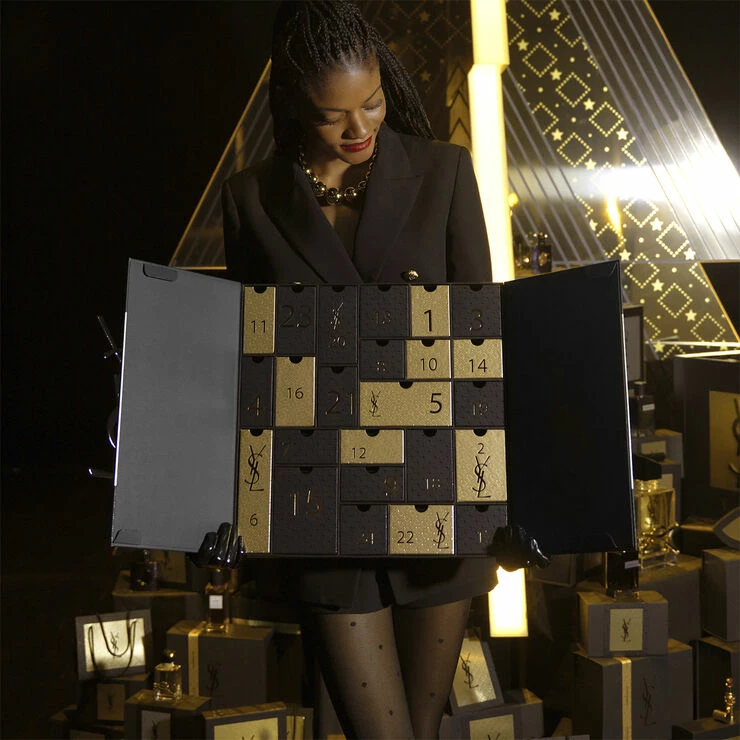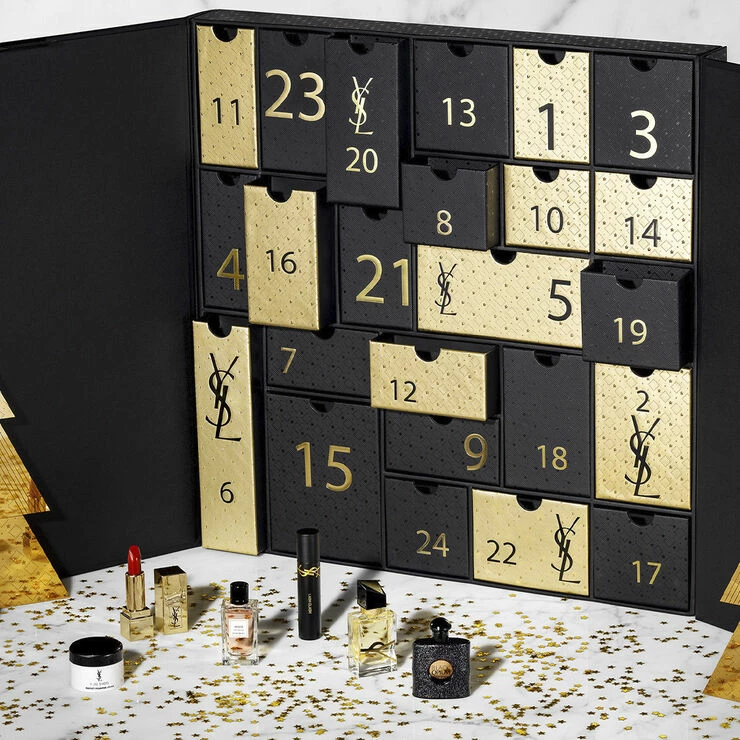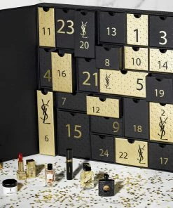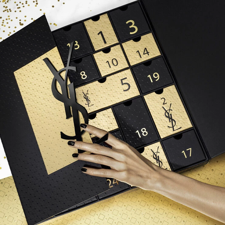 Har du fået invitationen? Det er tid til at fejre juletiden på fantastisk vis. Gør dig klar til at opleve en dekadent fest omkring et funklende juletræ. Nedtællingen er begyndt med YSL’s luksuriøse pakkekalender, der er prydet med sort, guld og det ikoniske logo. Skru op for musikken. Forkæl dig selv denne jul, og fejr det på den helt særlige YSL-måde.<br><br>Pakkekalenderen med 24 låger, der indeholder de mest ikoniske YSL-produkter: 4 makeup-produkter i fuld størrelse, 19 miniprodukter og 1 gave.<br><br>Indhold:<br>1. Black Opium Edp – 7,5 ml<br>2. Mon Paris Edp – 7,5 ml<br>3. Libre Edp – 7,5 ml<br>4. Blouse Edp – 7,5 ml<br>5.-9. Rouge Pur Couture Lipstick 21, 1, 70, 83, 1966 – 1,3 g<br>10. Rouge Pur Couture The Slim Lipstick 1966 – 2,2 g<br>11. Rouge Volupté Shine Lipstick 86 – 3,2 g<br>12. Slim Velvet Radical Lipstick 21 – 2 g<br>13. Tatouage Couture Velvet Cream 216 – 6 ml,<br>14. Biphase Makeup Remover – 8 ml<br>15. Mascara Volume Effet Faux Cils 1 – 2 ml<br>16. Mascara Volume Effet Faux Cils Radical 1 – 2 ml<br>17. Mascara Volume Extrême Lash Clash – 2 ml<br>18. Dessin Du Regard Eyepencil 1 – 0,8 g<br>19. Pure Shots Hydra Bounce Lotion – 10 ml<br>20. Touche Éclat Blur Primer – 10 ml<br>21. Pure Shots Night Reboot Serum – 7 ml<br>22. Pure Shots Perfect Plumper – 7 ml<br>23. Pure Shots Lines Away Serum – 7 ml<br>24. Spejl